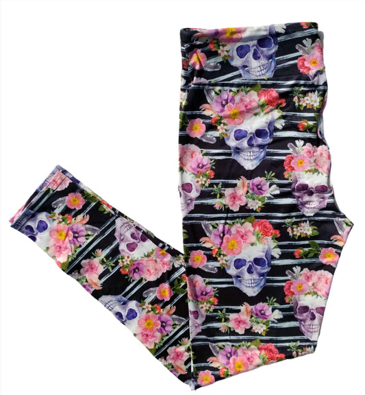 Deluxe - Striped Floral Skull - Full Length Leggings