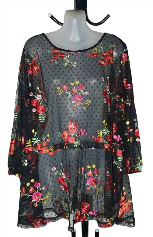 City Chic Medium - Sheer Spotted Floral Embroidered Tie Waist Top