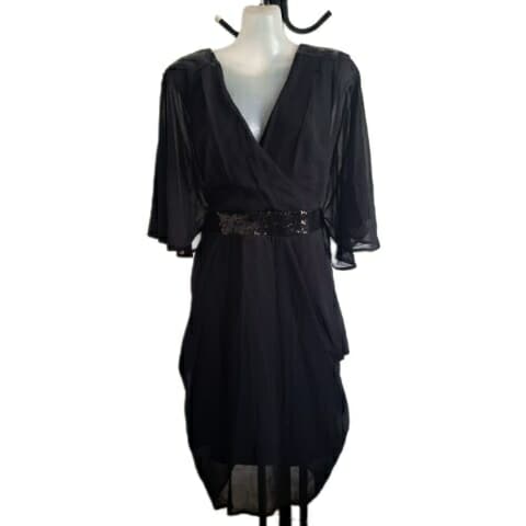 City Chic Small - Black Sequin Chiffon Faux Wrap Dress With Sleeves