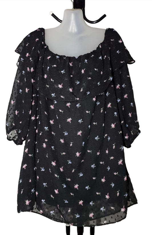 City Chic XL - Black Floral Sheer Sleeve Frill Off Shoulder Top
