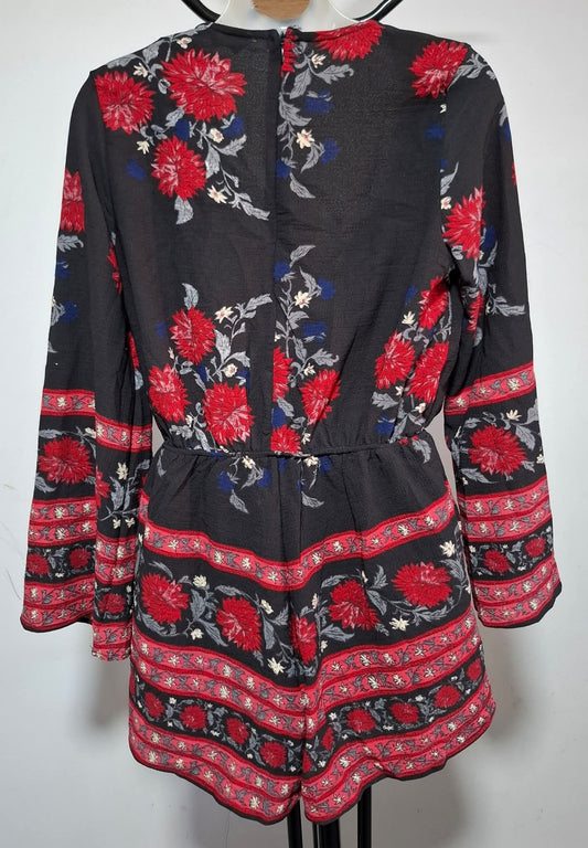 Size 10 - Black & Red Floral Lace Up Playsuit With Sleeves - Brand New With Tags