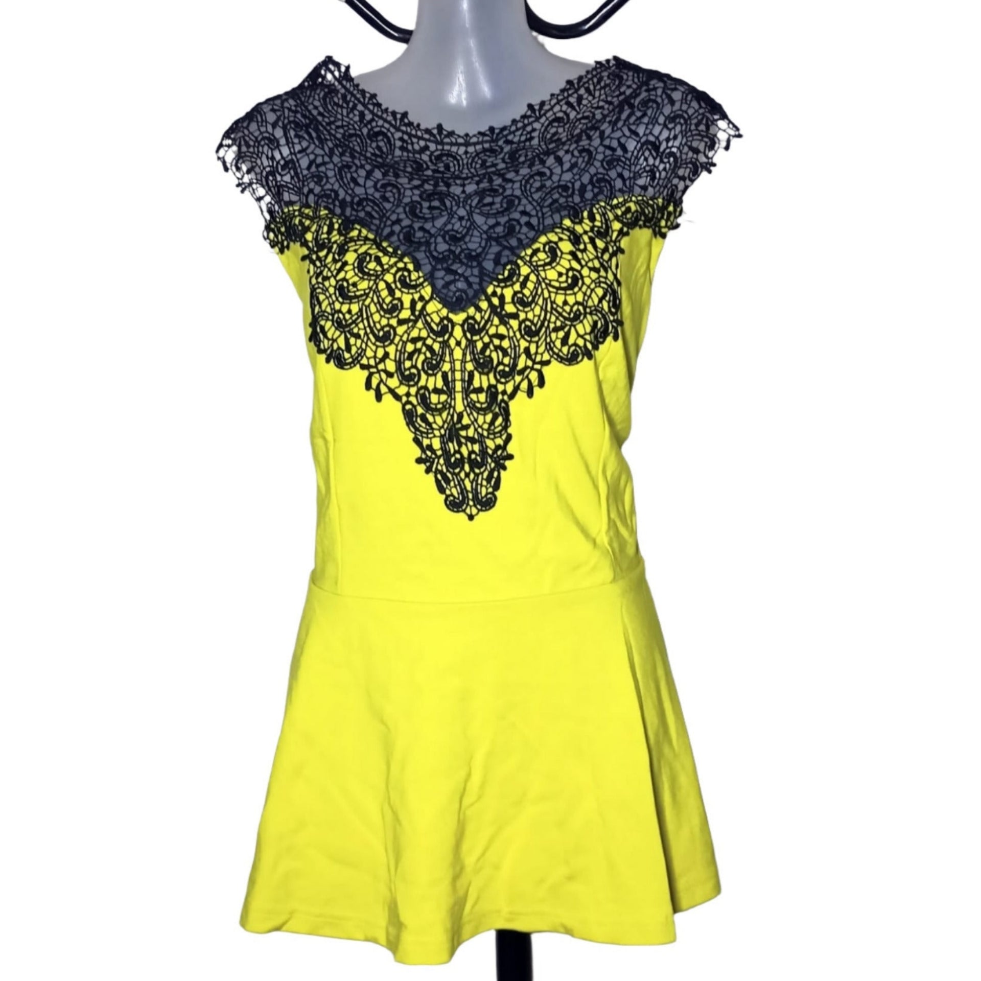Elevate your style with our stunning City Chic Medium peplum top in vibrant yellow with delicate black lace detail. The perfect combination of bold and feminine, this top will make you stand out in any crowd. Experience comfort and confidence in this must-have piece.