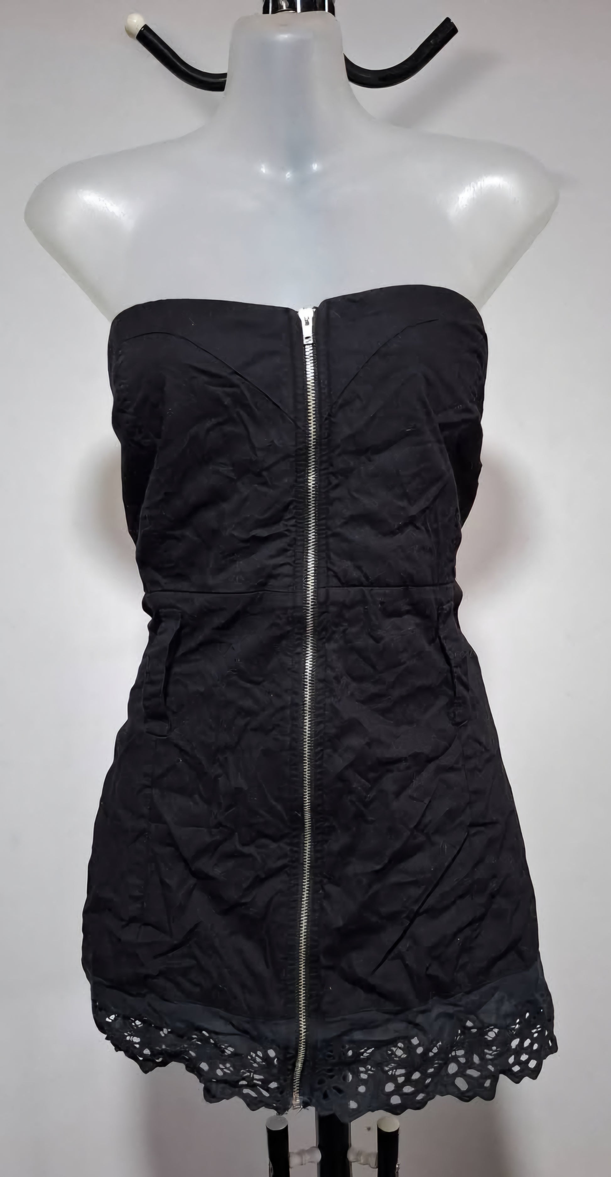 Elevate your wardrobe with this striking strapless zip-up top that seamlessly blends sophistication with edge. The sleek black silhouette offers versatile styling for any occasion, while the convenient zip-up front allows effortless layering and adjustable coverage. Delicate lace detailing along the bottom adds an unexpected touch of elegance, creating dimension and visual interest. Perfect for dressing up or down, this piece delivers confidence and style in one flattering design.