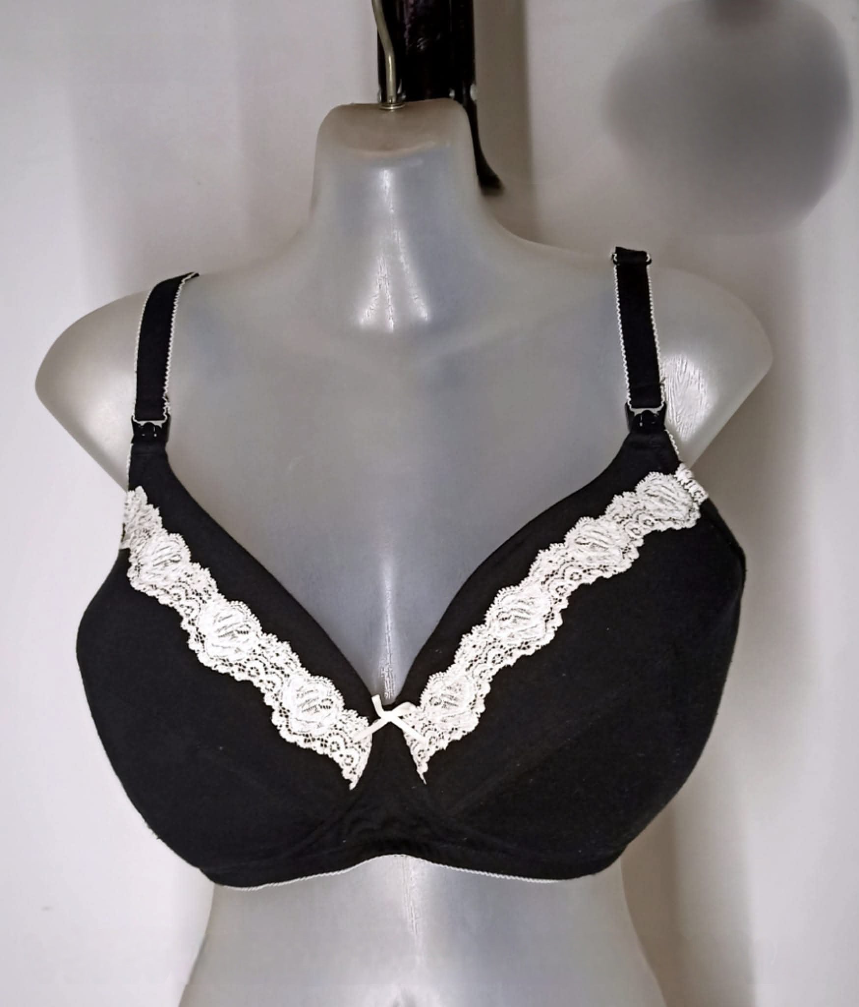 Designed for comfort during pregnancy and beyond, this black maternity bra features elegant white lace detailing and a soft, underwire-free construction that moves with your body. The innovative front clasps unclip effortlessly for convenient breastfeeding, while the adjustable back straps and six length adjustments ensure a perfect fit as your body changes. With three secure back clasps providing reliable support, this bra adapts to your needs throughout motherhood. Experience the freedom and ease you deserve during this special time.